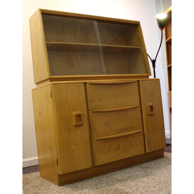 Latest addition to the collection: Some abrasion to original finish. Beautiful design and birch finish similar to heywood wakefield pieces. It is comprised of 2 pieces, a top hutch with glass doors and adjustable shelves, and a lower cabinet with doors, an adjustable shelf, and 1 dovetailed drawer. China cabinet hutch curio break front.